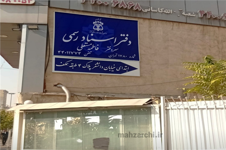 نشانی این محضر تهران، فلکه دوم صادقیه، خیابان آیتالله کاشانی، ابتدای خیابان دانشفر، پلاک 4، طبقه همکف، واحد 2 میباشد و شماره تلفن 09128387241 است.